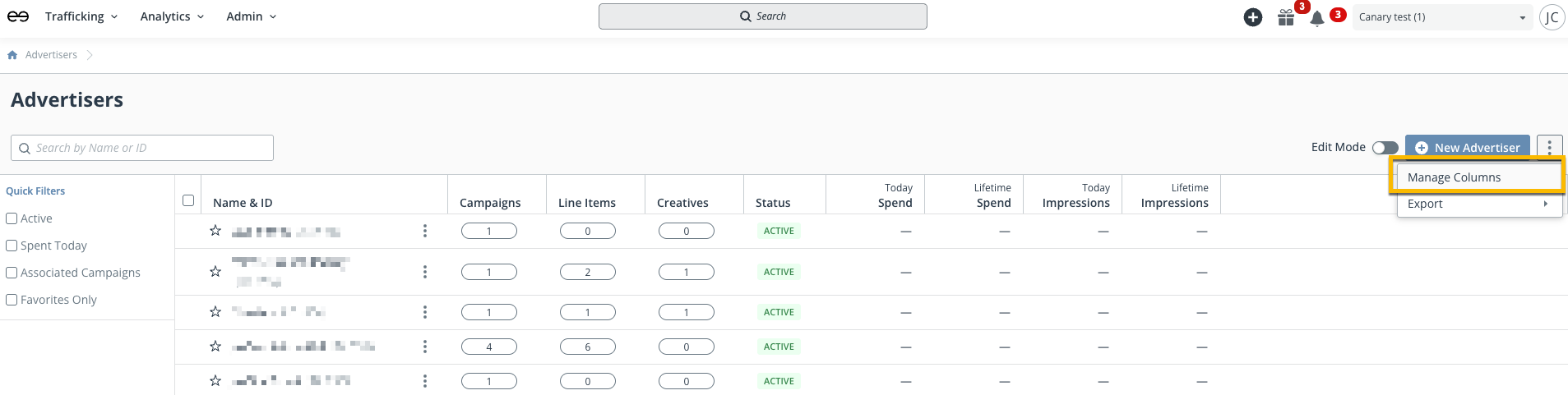 Columns will vary depending on the object screen. For instance, the advertiser list view will display different columns than the campaigns list view.