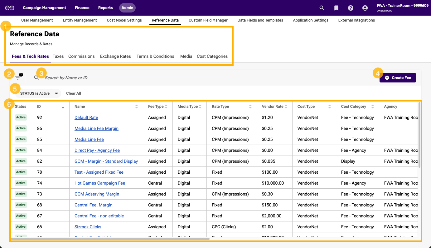 The Administration > Reference Data > Fees & Tech Rates tab displays information about an enterprise's Fee & Tech Rate records (often shortened as Fee records).