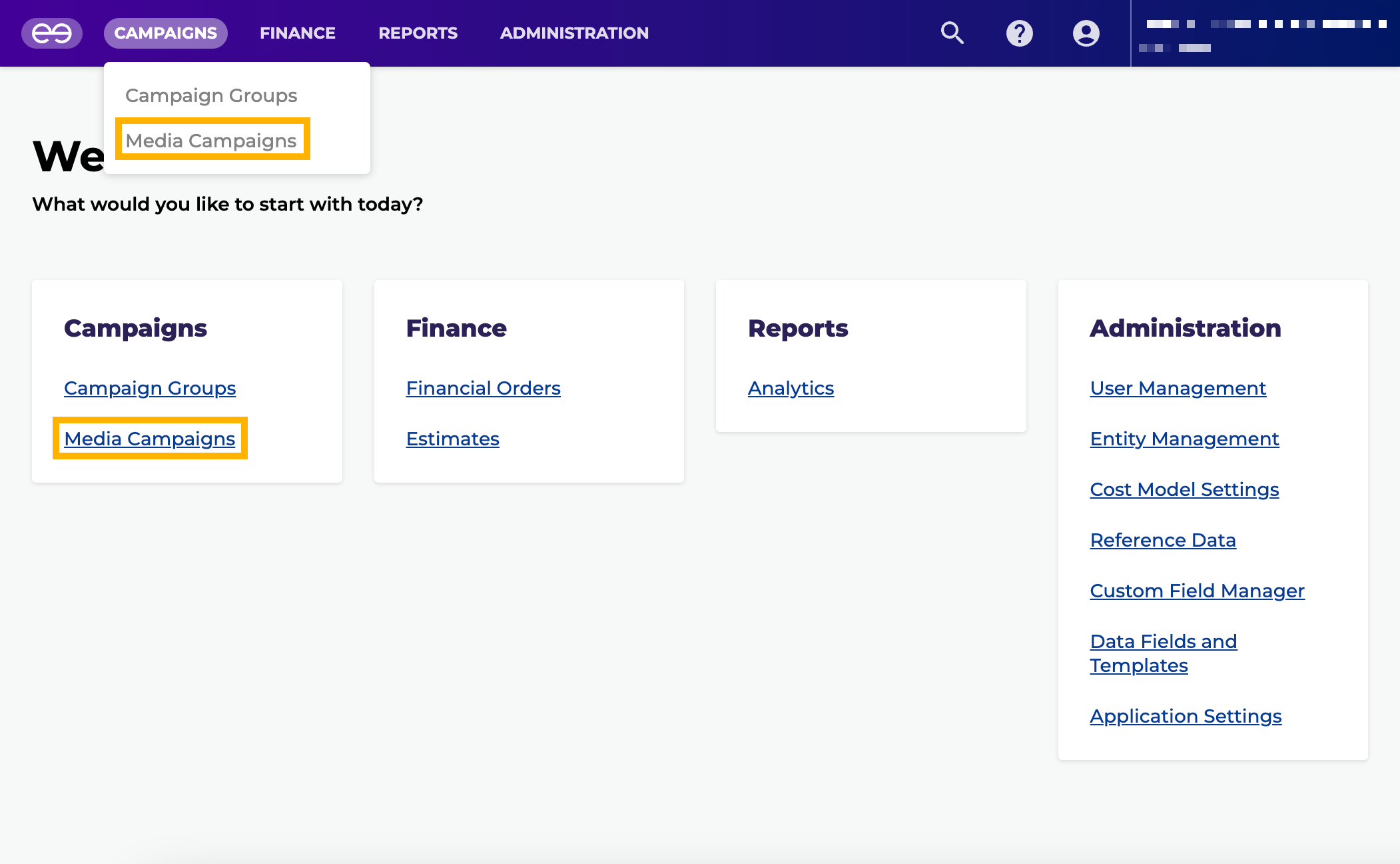 Access the Media Campaigns page from the top navigation bar under Campaigns, or from the Welcome home page under the Campaigns section.