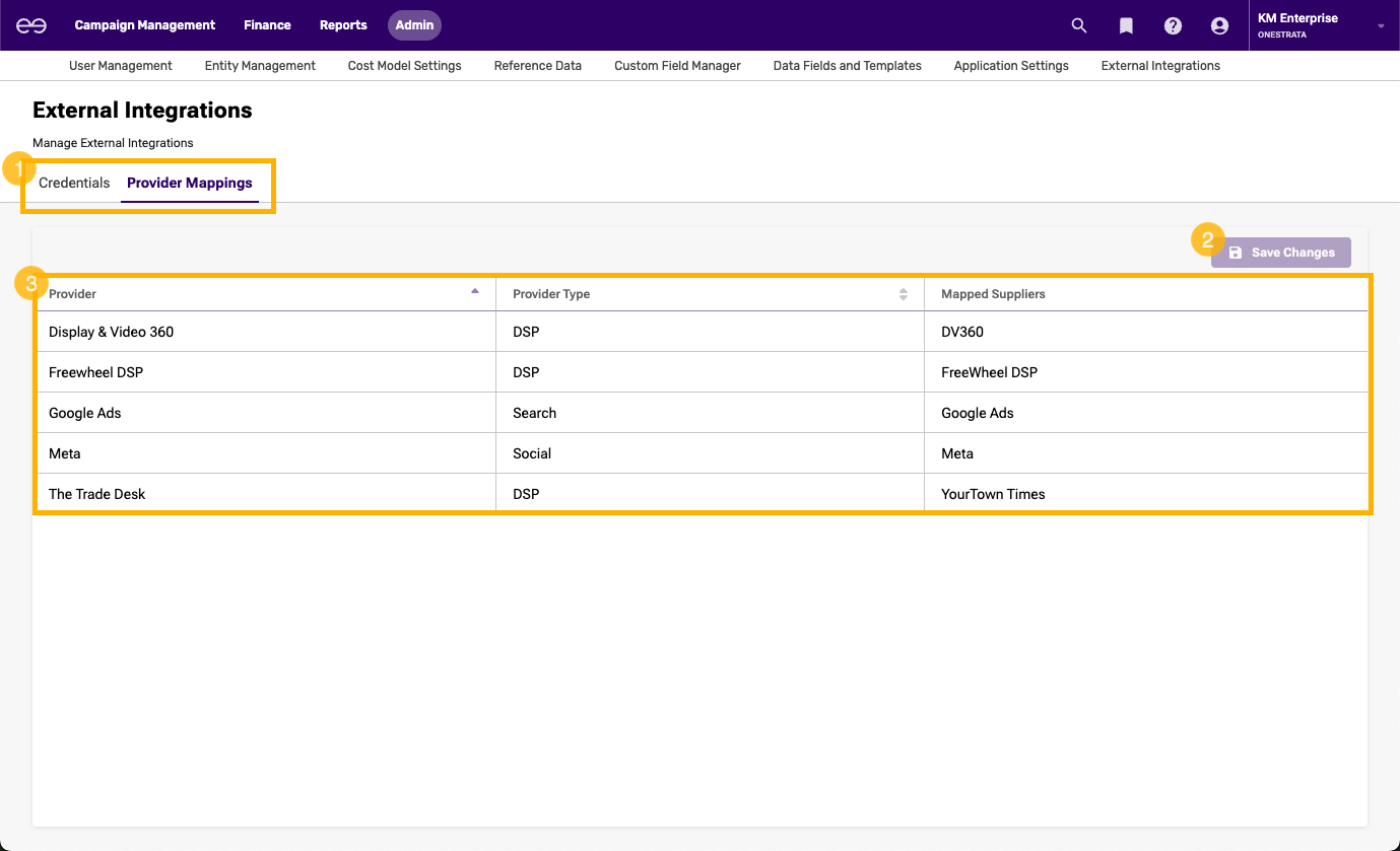 | 3 | Provider Mappings grid | Ad Server providers are not included in the Provider Mappings grid. For each programmatic (DSP, Search, or Social) provider, the Supplier(s) linked to that provider. |