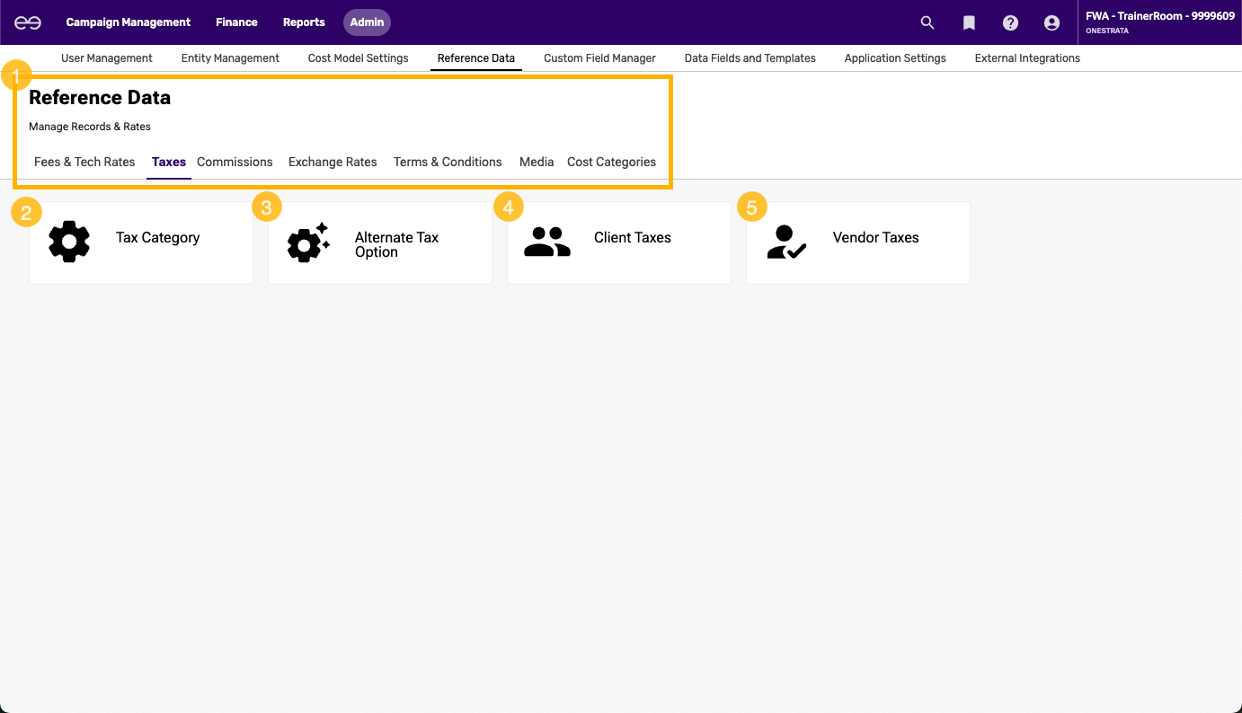 The Administration > Reference Data > Taxes tab displays information about an enterprise's Tax records.